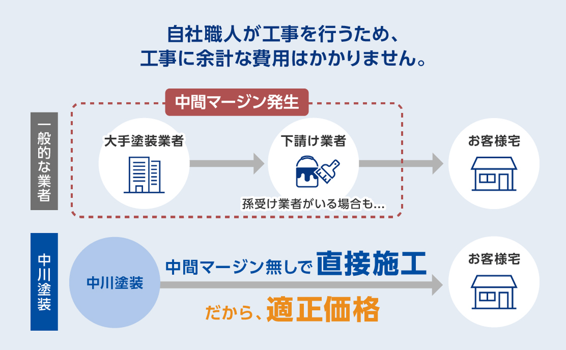 塗装工事業者の多くは、塗装工事を下請けや外注に任せるため、中間マージンが発生し、費用が高くなることもあります。